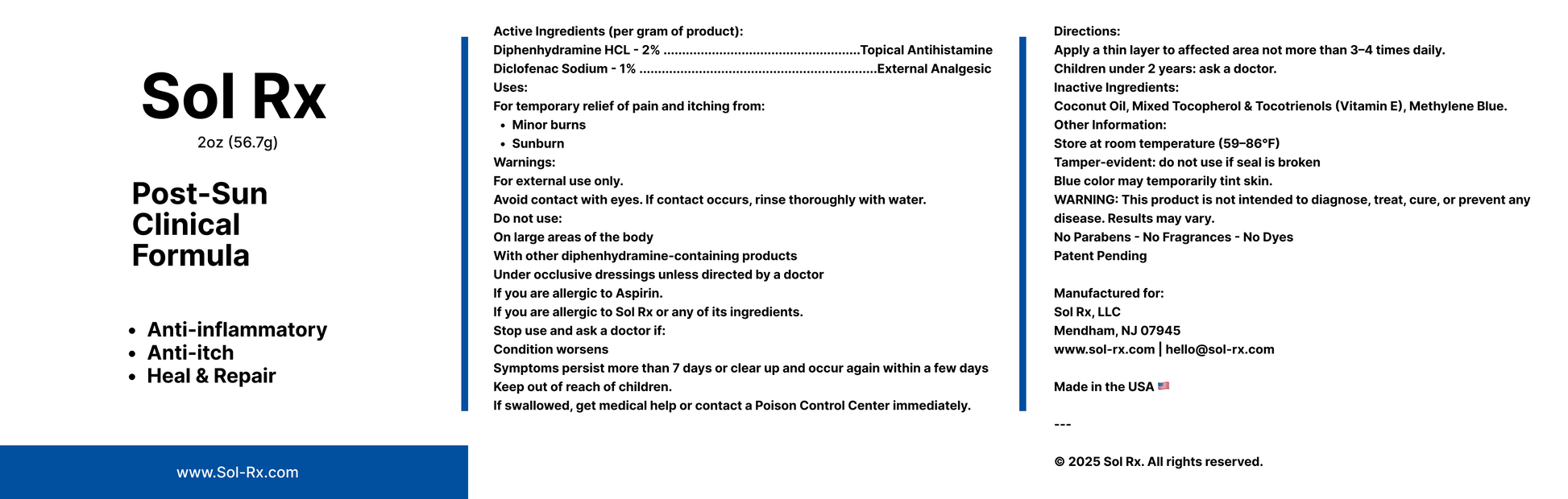 Sol Rx is a clinical-strength topical designed to help relieve common sun-exposure symptoms. Whether you're dealing with sunburn discomfort, redness, or itching, Sol Rx uses FDA-approved active ingredients to help you feel better, fast.